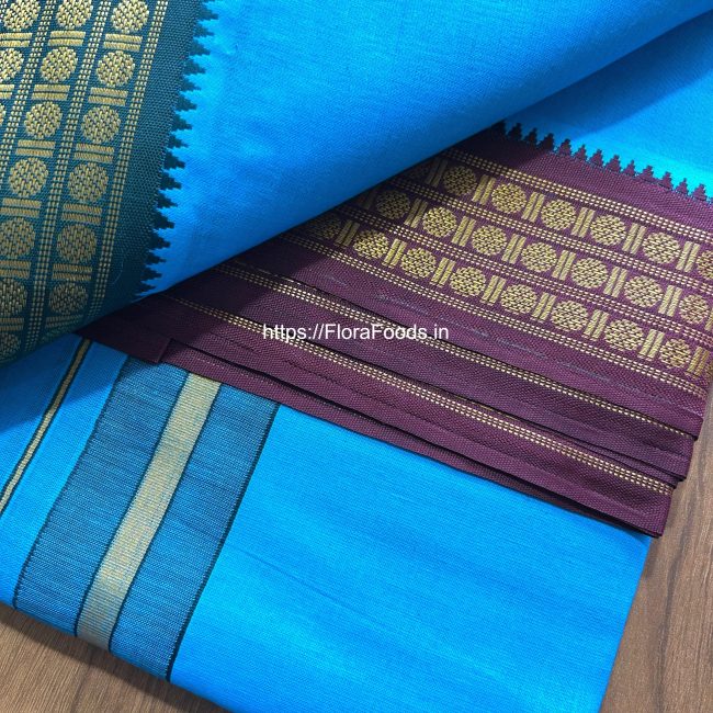 In many South Indian households, madi represents sanctity, worn or used during prayer in a spiritually pure state. This vibrant blue shade with elegant border detailing adds both reverence and grace to your sacred practices.