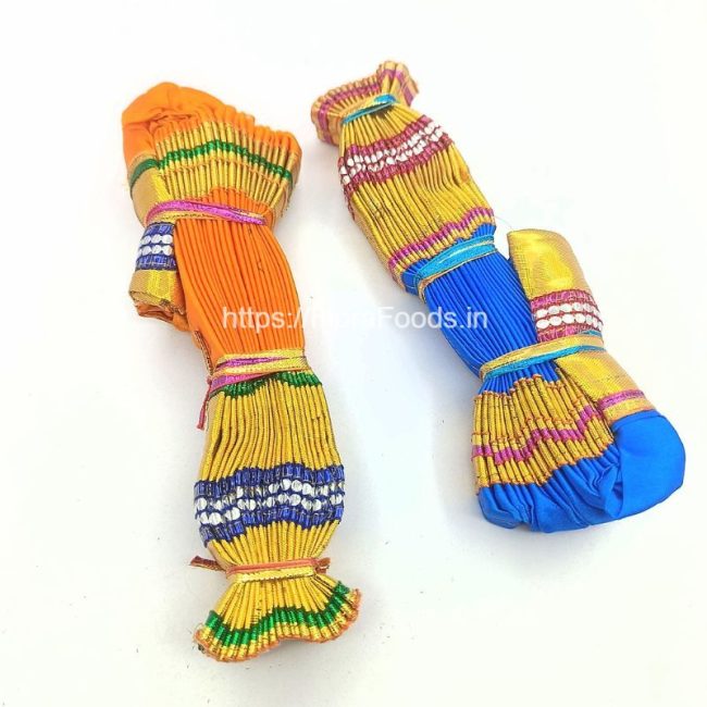 Ready made grand saree comes in various colours with silk finish of the cloth. The saree has to be tied to the Kalash on which the Coconut is kept & Gouri face can be fixed. The saree has a Pallu & attached Blouse like piece of cloth that has to be worn properly to the Diety/Devi. Then You can decorate Devi with your choice of the accessories like Mangal sootra, necklace, Bangles, ear rings etc.