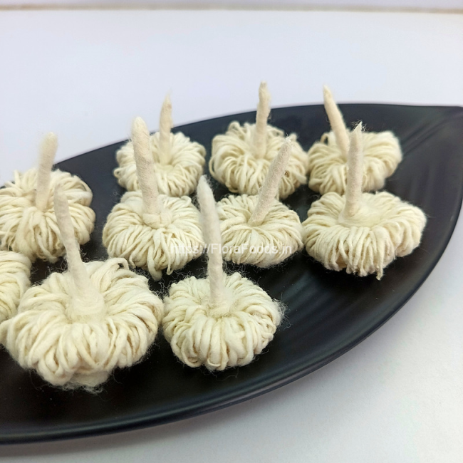 This dry Laksha Batti(1,00,000 String Wick)-1Set of 10Battis have to be soaked in ghee and dried to make them ready to keep in Pranati or big Diya’ to light them at once to make it 1Laksha’.