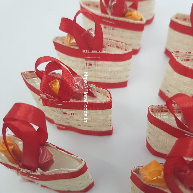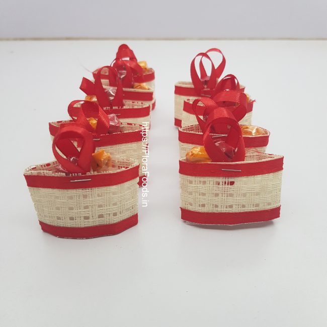 NOTE : There will not be actual Arishina-Kunkuma chits in the bags. If kept, will spill over and spoil the beauty of the bag. Here, in this particular net basket, the Red & Yellow Flowers signify Arishina & Kunkuma.