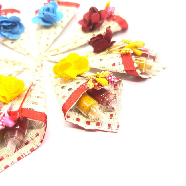 - Variants of Tradition: Reflecting the transformation of traditional haldi-kumkum packets, this bouquet offers a fancy and decorative version, crafted with care to suit the grandeur of your special events.