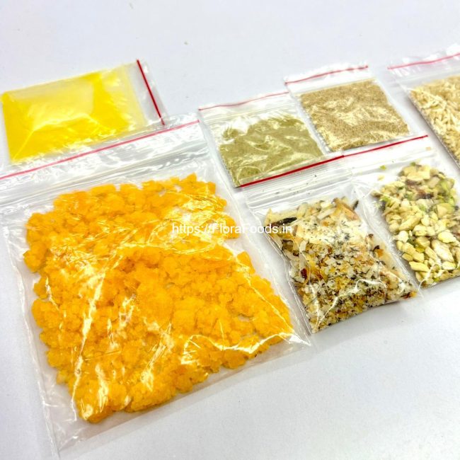 Ghee, Savatebeeja, Dry Fruits chunks, Jaggery, Poppy seeds, Roasted grated Dry coconut, clove and Cardamom Powder