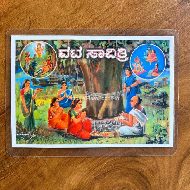 Observed by Hindu married women, especially in Karnataka, Maharashtra, and South India, the Vatasavitri Vrata is a symbol of ideal marital devotion and inner strength. On Amavasya of the Jyeshtha month, women perform rituals beneath a Banyan tree, tying sacred threads around its trunk and reciting the divine tale of Savitri, praying for the longevity and well-being of their husbands. In South India, this puja is also performed during Vatapournima, often placing this sacred photo at the altar or beneath the tree as part of the ritual.